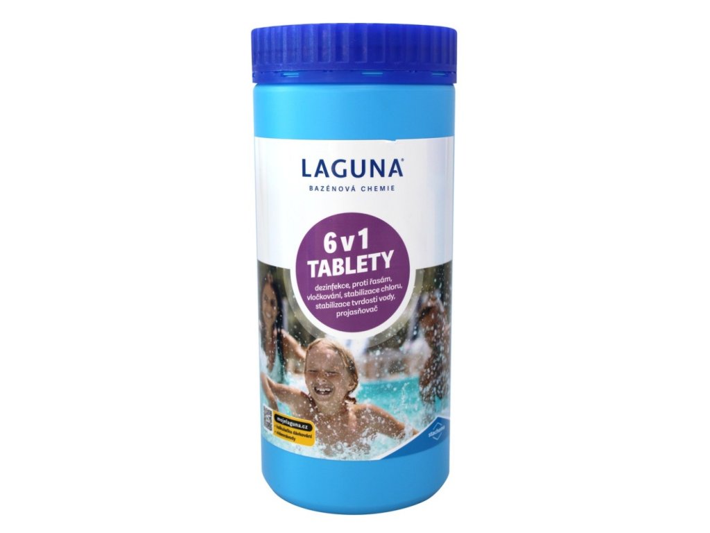 Laguna 6v1 tablety je moderní víceúčelový přípravek pro celosezónní průběžnou údržbu vody ve všech typech bazénů. Slouží jako dezinfekční přípravek, současně umožňuje vyvločkování nečistot, likviduje řasy a zabraňuje jejich růstu, stabilizuje chlor ve vodě, projasňuje-zlepšuje zachycení nečistot ve filtraci a stabilizuje tvrdost vody.