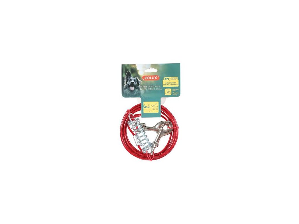 Uvazovací lanko zaručuje bezpečné přivázání psa v terénu, například na zahradě nebo na výletě. Vybaveno ocelovou karabinou a pružinou tlumící nárazy, poskytuje zvířeti velkou volnost pohybu a zároveň eliminuje riziko úniku. Vyrobeno z odolných materiálů nejvyšší kvality - ocelové lanko potažené červeným plastem. Má antistrečový systém a je vhodný pro psy vážící méně než 45 kg.