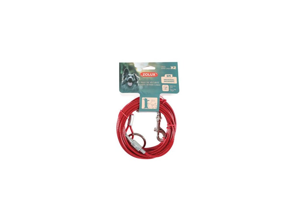 Univerzální uvazovací lanko umožní zvířeti volný pohyb bez rizika útěku v prostorách, kde jej nelze volně ponechat. Vybaveno ocelovou karabinou. Vyrobeno z odolných materiálů nejvyšší kvality - ocelové lanko potažené červeným plastem. Zaručí bezpečnost psa i ostatních uživatelů daného prostoru, je vhodný pro psy vážící méně než 45 kg.