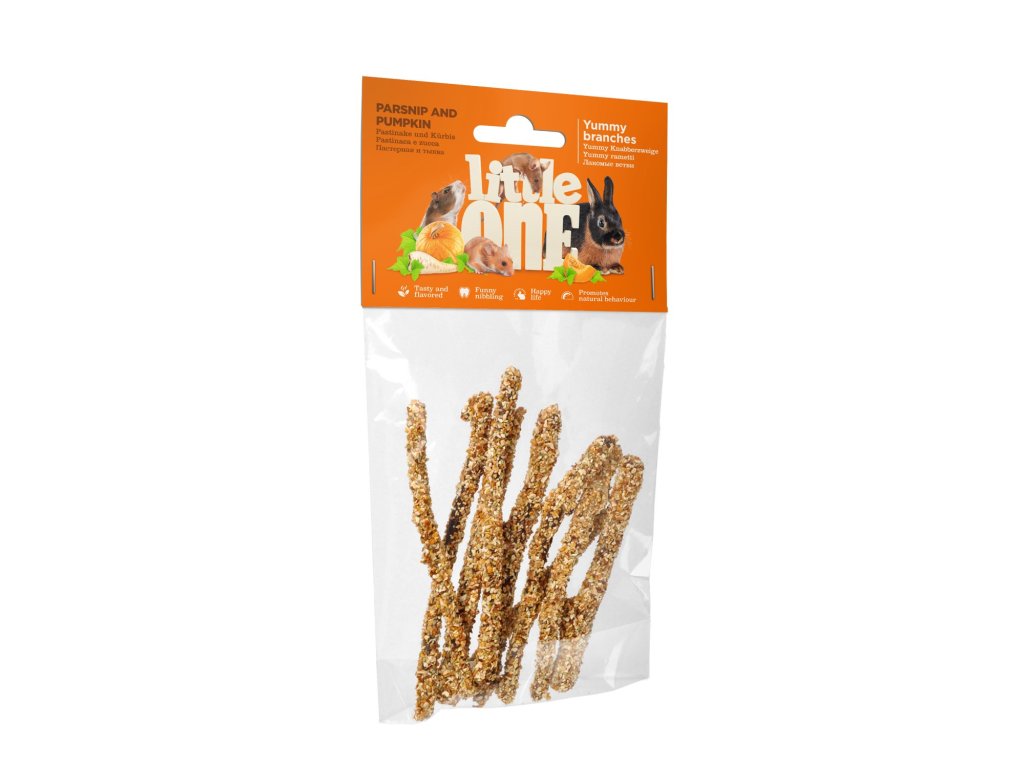 Little One ochucené větvičky s pastinákem a dýníLittle One ochucené větvičky s pastinákem a dýní jsou báječné větve, které jsou prospěšným doplňkem stravy malých savců a jsou i jejich milovanou pochoutkou. Slouží i k obrušování zubů a k zabavení vašeho mazlíka. Pamlsek je zdrojem vitaminu C, vitaminů skupiny B, betakarotenu a éterických olejů obsažených v zelenině. Obsah balení 35 g.