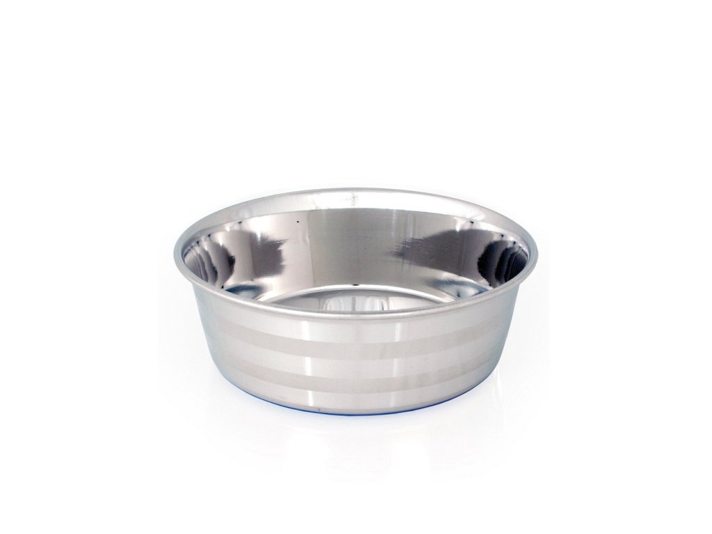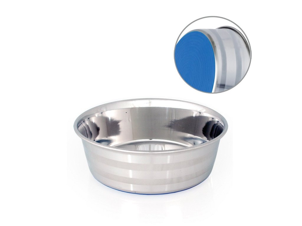Nerezová miska zdobená o gravírované pruhy s protiskluzovým silikonovým dnem v modré barvě. Vhodná jako základní miska na vodu i na krmivo.