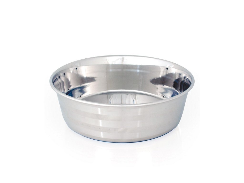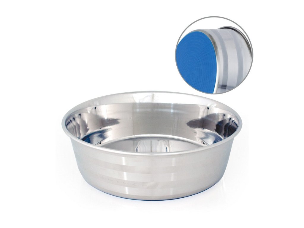 Nerezová miska zdobená o gravírované pruhy s protiskluzovým silikonovým dnem v modré barvě. Vhodná jako základní miska na vodu i na krmivo.
