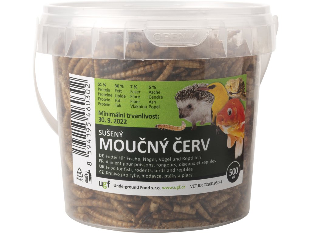 Moučný červ 500 mlMoučný červ, tedy jeho sušené larvy jsou vhodným doplňkem stravy ptáků vč. drůbeže, ryb, ještěrek, leguánů, želv, žab, ježků, křečků, myší, potkanů a jiných malých savců, koček a psů. Moučný červ je larva potemníka moučného a má z hmyzu nejvyváženější podíl proteinů (51 %) a tuků (30 %). Je zdrojem probiotické vlákniny, vitaminů, minerálů a stopových prvků (komplex B, A, P, Ca, Mg, Fe, Zn). Zároveň obsahuje přirozeně se vyskytující taurin, který je nezbytný pro dobrý zdravotní stav zvířat a do krmiv je jinak přidávám synteticky. Tato pochoutka podporuje zdravou kůži, srst, drápy, reprodukci, snůšku a posiluje imunitní systém zvířete.