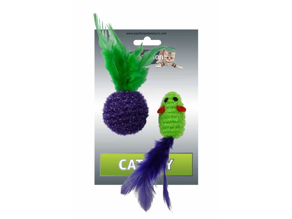 Myš a míček s peřímHračky s peřím určená pro kočky.