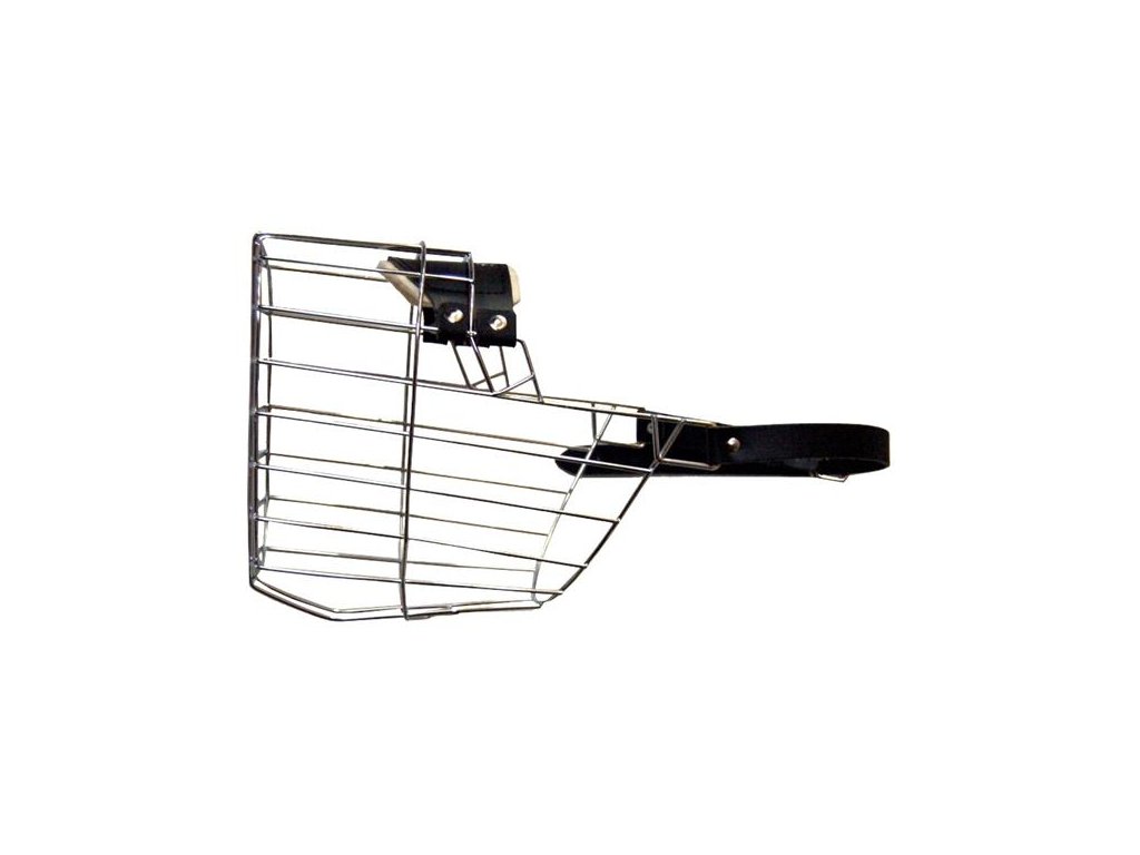 Kovový náhubek s koženými řemínky na zapínání. Vhodný zejména pro německé ovčáky a podobná plemena.