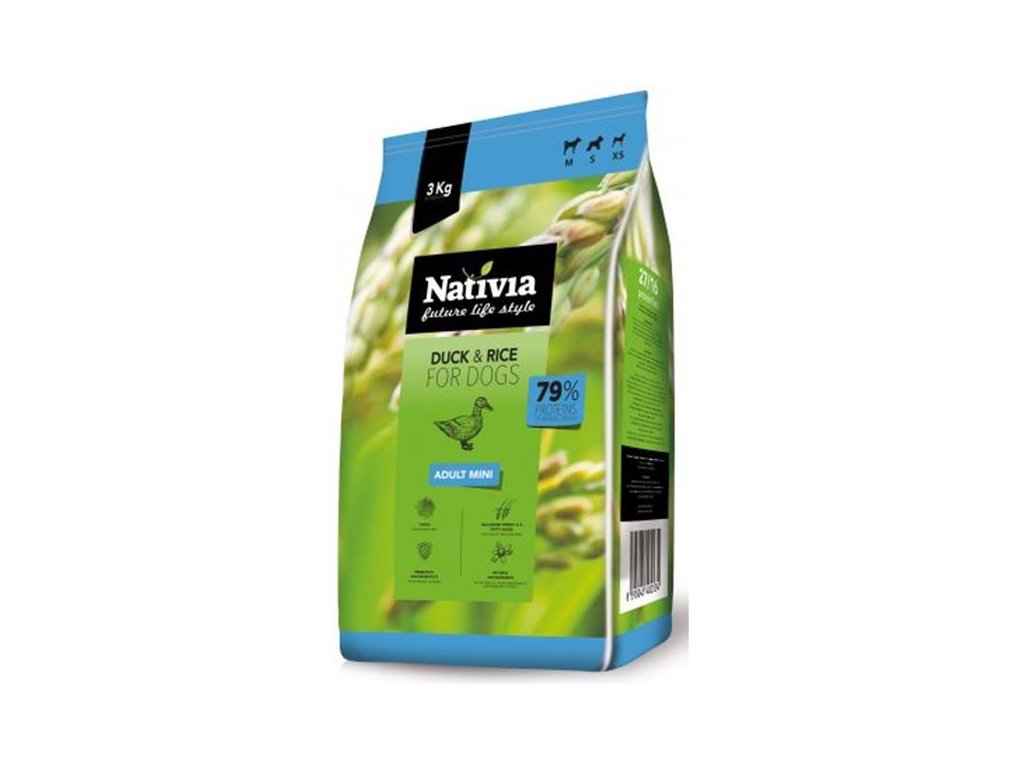České krmivo pro psy bez obilovin vyhovuje dospělým psům (od 10měsíců - 10let) malých plemen. Granule Nativia Adult Mini Duck & Rice receptura respektuje přirozené zákonitosti výživy psa. Krmivo obsahuje prebiotika a probiotika pro podporu imunity, juku pro redukci zápachu exkrementů, vyvážený poměr omega 3 a 6 mastných kyselin pro krásnou a zdravou srst i kůži. Obvyklá kombinace obilovin či brambor je zcela nahrazena pouze kvalitní rýží, ta svojí stravitelností a profilem aminokyselin tyto tradiční suroviny převyšuje, nezatěžuje organismus a společně s ostatními komponentami výrobku zajistí zdravou výživu psa. 79 % bílkovin pochází z živočišných surovin a sacharidy jsou získávány pouze z kvalitní rýže - neobsahuje kukuřici, pšenici ani sóju. Ke konzervaci jsou použity přírodní antioxidanty, a to směs tokoferolů a rozmarýnového extraktu.