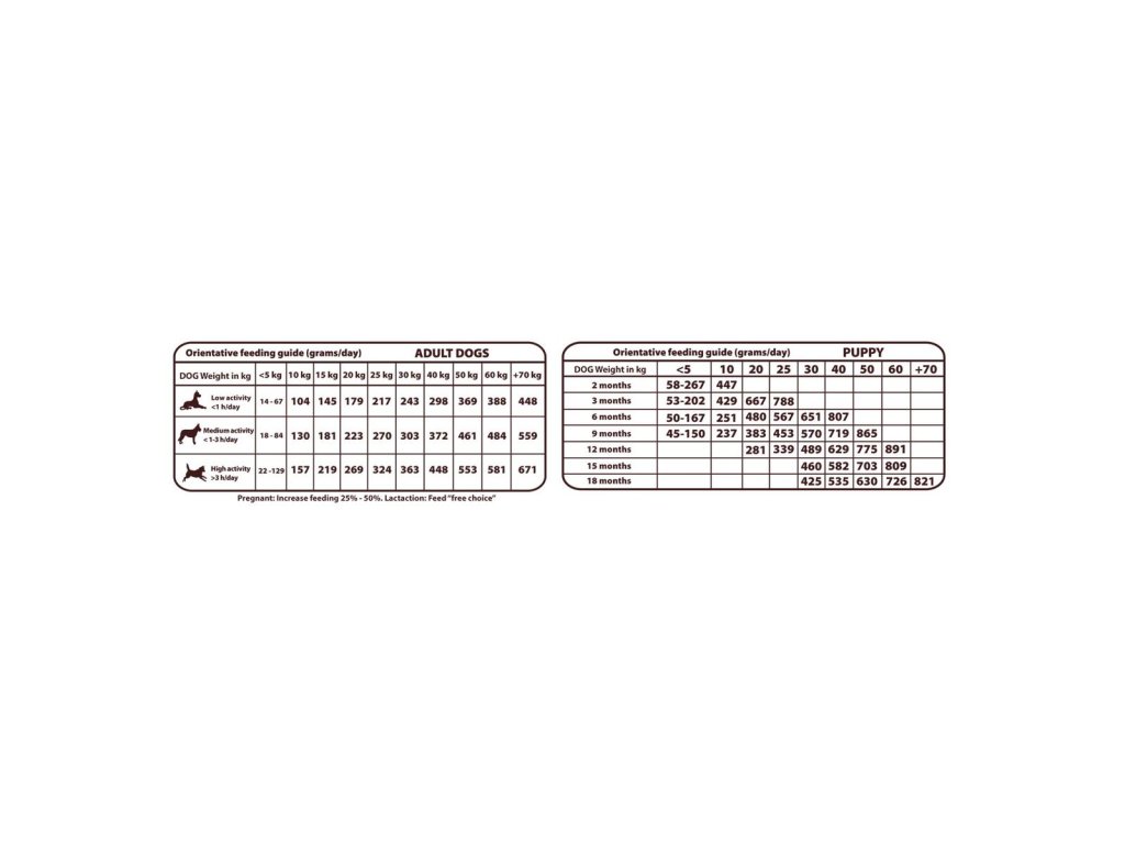 Analytické složení: Hrubý protein (33 %), hrubé oleje a tuky (19 %), hrubá vláknina (2,5 %), hrubý popel (7 %), vápník (1,3 %), fosfor (1 %), omega 3 mastné kyseliny (0,5 %), omega 6 mastné kyseliny (3,5 %), EPA+DHA (0,5 %).