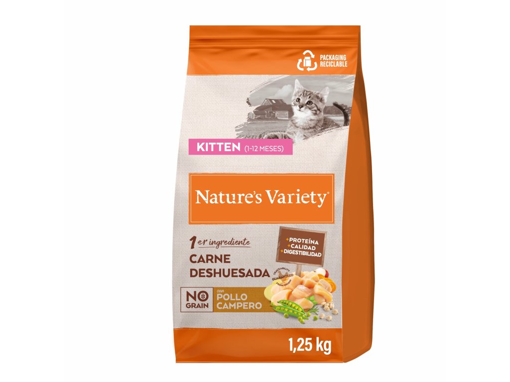 Kompletní a vyvážené krmivo pro koťata s masem bez kostí jako hlavní složkou pro trávení a lepší výživu.S hráškem, cizrnou a bramborami, jako přirozený zdroj sacharidů, které dodávají kočce energii.