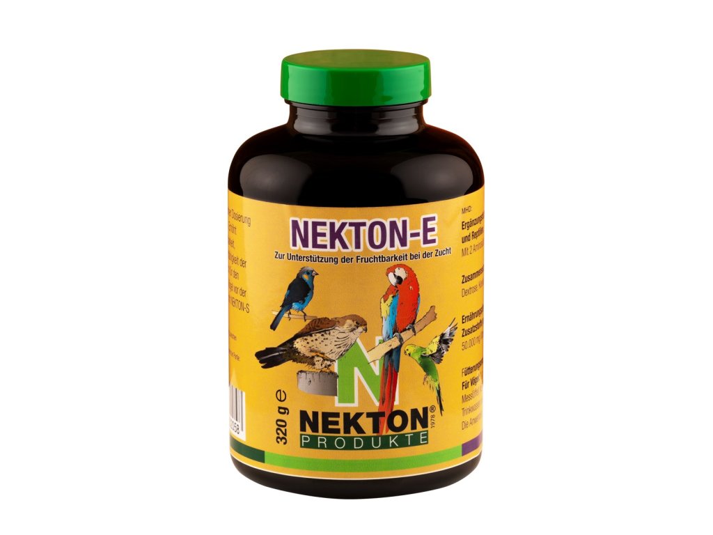 NEKTON-E v podobě rozpustného prášku poskytuje chovatelům ideální formu pro dávkování. Stačí jej přidávat do měkkého krmiva nebo vody. Po přidání do studené vody může NEKTON-E tvořit mléčnou, kalnou substanci. Toto je naprosto v pořádku, stejně tak jako usazeniny na okrajích nádoby. Jedná se pouze o substanci, nesoucí přídavné látky. Vitaminy jsou kompletně rozpustné. Ideální je kombinace s NEKTON S.Používejte NEKTON E cca 3 týdny před začátkem chovné sezóny a přestaňte jej ptákům nabízet, jakmile se objeví první snůšky.