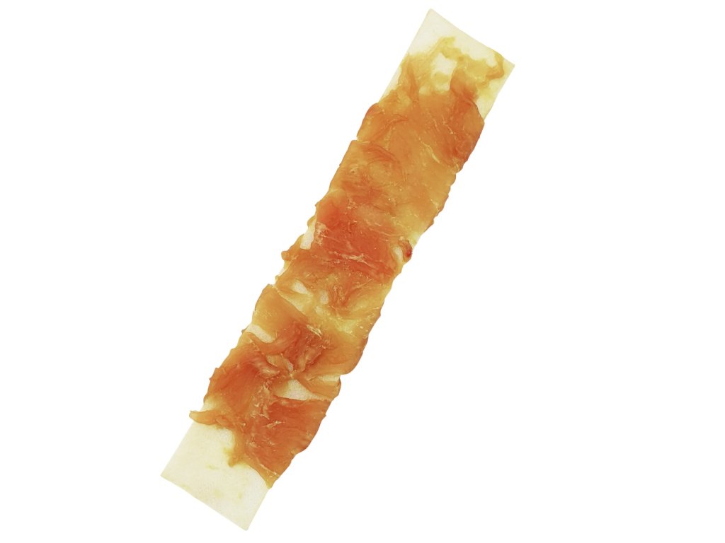 Doplňkové krmivo pro psy. Obsah tuku pouhých 3,1 %. Žvýkací ploché tyčinky jsou bez obilovin a neobsahují žádné další přísady. Praktický znovu uzavíratelný obal 70g. Velikost 18cm. V jednom balení jsou 3 ks plochých tyčinek. Složení: maso a produkty živočišného původu (54,5% kuřecí maso, 41,0% hovězí kůže), rostlinný produkt, rostlinný proteinový extrakt (2,0% arašídový protein, 1,5% hrachový protein), minerální látky. Analytické složky: hrubý protein 75%, hrubý tuk 3,1%, hrubý popel 1,9%, hrubá vláknina 0,5%, vlhkost 16,1% Doplňkové látky: neobsahujeDoplňkové parametry
