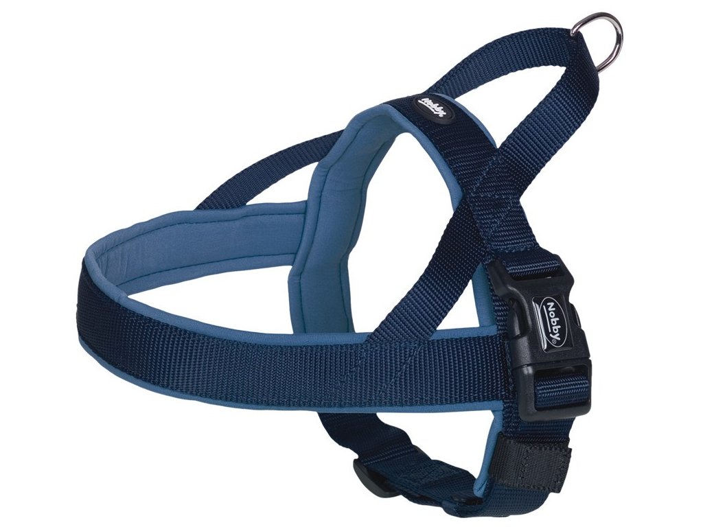 Norský postroj pro psy s neoprénovou podšívkou se vyznačuje pohodlným a snadným oblékáním. Je vhodný jak na každodenní procházky, tak pro tréninky nejrůznějších sportů (agility, flyball - zde poslouží především pohodlné očko na zádech pro snadnou manipulaci se psem). Velikost: délka hrudní části 62 cm šířka popruhu 40/45 mm plynule nastavitelný obvod hrudníku 75-98 cm Materiál: horní strana: modrý nylon spodní strana: modrý neoprén Neoprenová podšívka je šetrná k srsti psa, ale také rychle schne, když se pes v létě rád koupe. Pohodlné polstrování z neoprénu v oblasti hrudníku, krku a ramen. Optimální pohodlí při nošení a také zajištění, že psa při běhu postroj nedře a nevytrhává srst. Snadné a rychlé nasazování postroje. Rychlé zapnutí vodítka pomocí horního poutka. Norský postroj byl vyvinut speciálně pro aktivní psy a chovatele psů, a proto je ideální pro jízdu na kole nebo jogging. Postroj zaručuje Vašemu psovi pohodlné nošení, i když mírně táhne. Všité držadlo na obojku umožňuje majiteli psa, aby mohl rychle reagovat v nastalé situaci a případně nechal psa jít u nohy. Postroj Nobby zaručuje vysokou kvalitu a funkčnost v kombinaci s atraktivním designem.Doplňkové parametry