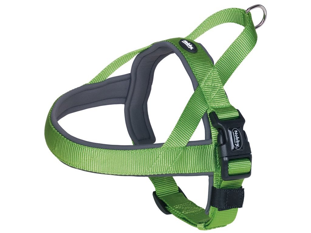 Norský postroj pro psy s neoprénovou podšívkou se vyznačuje pohodlným a snadným oblékáním. Je vhodný jak na každodenní procházky, tak pro tréninky nejrůznějších sportů (agility, flyball - zde poslouží především pohodlné očko na zádech pro snadnou manipulaci se psem). Velikost: délka hrudní části 62 cm šířka popruhu 40/45 mm plynule nastavitelný obvod hrudníku 75-98 cm Materiál: horní strana: zelený nylon spodní strana: šedý neoprén Neoprenová podšívka je šetrná k srsti psa, ale také rychle schne, když se pes v létě rád koupe. Pohodlné polstrování z neoprénu v oblasti hrudníku, krku a ramen. Optimální pohodlí při nošení a také zajištění, že psa při běhu postroj nedře a nevytrhává srst. Snadné a rychlé nasazování postroje. Rychlé zapnutí vodítka pomocí horního poutka. Norský postroj byl vyvinut speciálně pro aktivní psy a chovatele psů, a proto je ideální pro jízdu na kole nebo jogging. Postroj zaručuje Vašemu psovi pohodlné nošení, i když mírně táhne. Všité držadlo na obojku umožňuje majiteli psa, aby mohl rychle reagovat v nastalé situaci a případně nechal psa jít u nohy. Postroj Nobby zaručuje vysokou kvalitu a funkčnost v kombinaci s atraktivním designem.Doplňkové parametry
