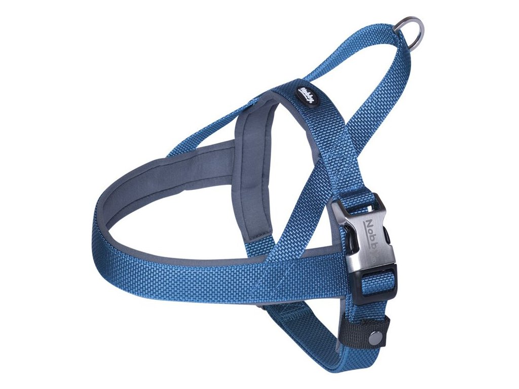 Moderní norský postroj Nobby pro psy vyrobený z nylonu a neoprénu. Vyznačuje pohodlným a snadným oblékáním. Je vhodný jak na každodenní procházky, tak pro tréninky nejrůznějších sportů (agility, flyball - zde poslouží především pohodlné očko na zádech pro snadnou manipulaci se psem). Vrchní vrstva z nylonu vzhledově vytváří elegantní dojem. Přezka na zapínání je vyrobená z leštěného kovu a plastu. Elegantní a zároveň funkční. Velikost: délka hrudní části 54 cm šířka popruhů 40-45 mm plynule nastavitelný obvod hrudníku 68-85 cm barva modrá Neoprenová podšívka je šetrná k srsti psa, ale také rychle schne, když se pes v létě rád koupe. Pohodlné polstrování z neoprénu v oblasti hrudníku, krku a ramen. Optimální pohodlí při nošení a také zajištění, že psa při běhu postroj nedře a nevytrhává srst. Snadné a rychlé nasazování postroje. Rychlé zapnutí vodítka pomocí horního poutka. Norský postroj byl vyvinut speciálně pro aktivní psy a chovatele psů, a proto je ideální pro jízdu na kole nebo jogging. Postroj zaručuje Vašemu psovi pohodlné nošení, i když mírně táhne. Všité držadlo na obojku umožňuje majiteli psa, aby mohl rychle reagovat v nastalé situaci a případně nechal psa jít u nohy. Postroj Nobby zaručuje vysokou kvalitu a funkčnost v kombinaci s atraktivním designem.Doplňkové parametry