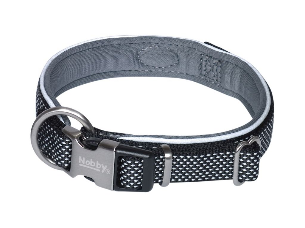 Velmi kvalitní neoprénový obojek Nobby v krásném elegantním provedení. Vrchní vrstva obojku je z nylonu a vzhledově působí velmi elegantně. Neoprénová podšívka je šetrná k srsti psa. Přezka na zapínání je vyrobená z leštěného kovu a plastu. Upevnění kovového kroužku a pozice přezky zabraňuje jejímu přetížení. Bespečnost zajišťují vysoce viditelné reflexní pruhy na krajích obojku. Nastavitelná velikost: 32-39 cm Šířka obojku: 15/20 mm Barva černá.Doplňkové parametry