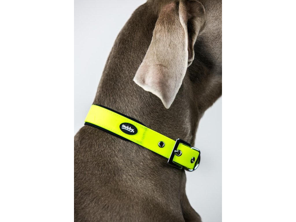 Plastový obojek z kolekce Nobby COVER je vyroben ze dvou vrstev (polyesterová tkanina s nánosem PVC + neoprénová podšívka). Neoprén je velice měkký a poddajný, nenasákavý, takže obojek po koupání pejska nezapáchá. Obojek je ohebný a zároveň velmi pevný. Velmi snadno se čistí, lze jej dezinfikovat. Pro obvod krku 40-50cm Šířka obojku 25mm Barva žlutá (PVC) + černé neoprénové polstrování. Výhody: odolnost vůči UV záření antibakteriální (odolnost proti plísním) voděodolnýDoplňkové parametry