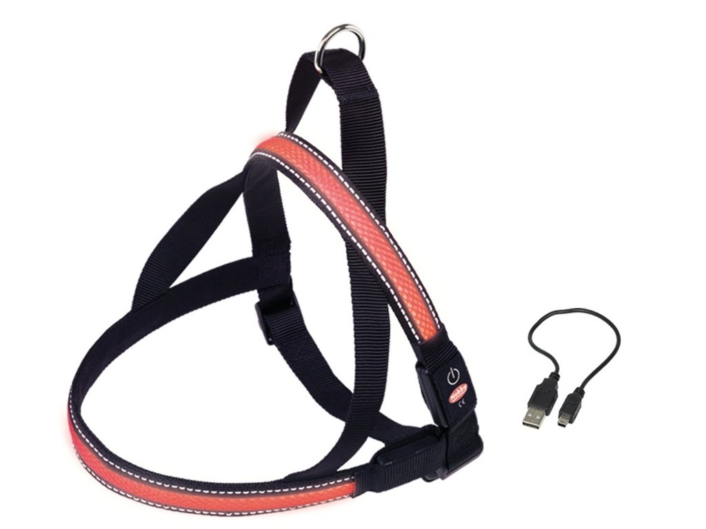 100% nepřehlédnutelný svítící postroj s LED diody a s vysoce viditelnými reflexní pruhy. Délka hrudní části 52 cm Šířka postroje 25 mm Plynule nastavitelný obvod hrudníku 60 - 75 cm Odolné vůči dešti. Červený svítící postroj je praktickým průvodcem při nočních procházkách s Vaším čtyřnohým kamarádem nebo v ročních obdobích s nedostatkem světla. Vašeho psa budete vidět Vy i ostatní účastníci silničního provozu do vzdálenosti až 500 m po dobu 2 hodin. Jakmile se LED světla vybijí, můžete je opětovně dobít pomocí USB kabelu, který je součástí balení. Světlo můžete nastavit do tří různých režimů: pokud zmáčknete 1x tlačítko ON/OFF, bude světlo blikat v krátkých intervalech a bude dobře viditelné při setmění nebo deštivém počasí. Pokud zmáčknete tlačítko ještě jednou, prodloužíte tak intervaly blikání. Nastavením do třetího režimu bude červené světlo svítit nepřetržitě a Váš pes tak bude nepřehlédnutelný i pro ostatní účastníky silničního provozu. Vašeho psa tak již nikdy při společných procházkách neztratíte z dohledu!Doplňkové parametry