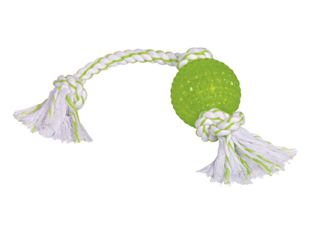 Hračka pro psy z TRP gumy. Míček s bavlněnným lanem. S vůní máty a s pískátkem. Lano vyrobené z bavlny. Hračka je plovoucí. Velikost: celková velikost 44cm míček ø 8 cm Upozornění: Hračku používejte pod dohledem. Poškozenou hračku vyměňte za novou, aby nedošlo k poranění zvířete. Není vhodné pro děti.Doplňkové parametry