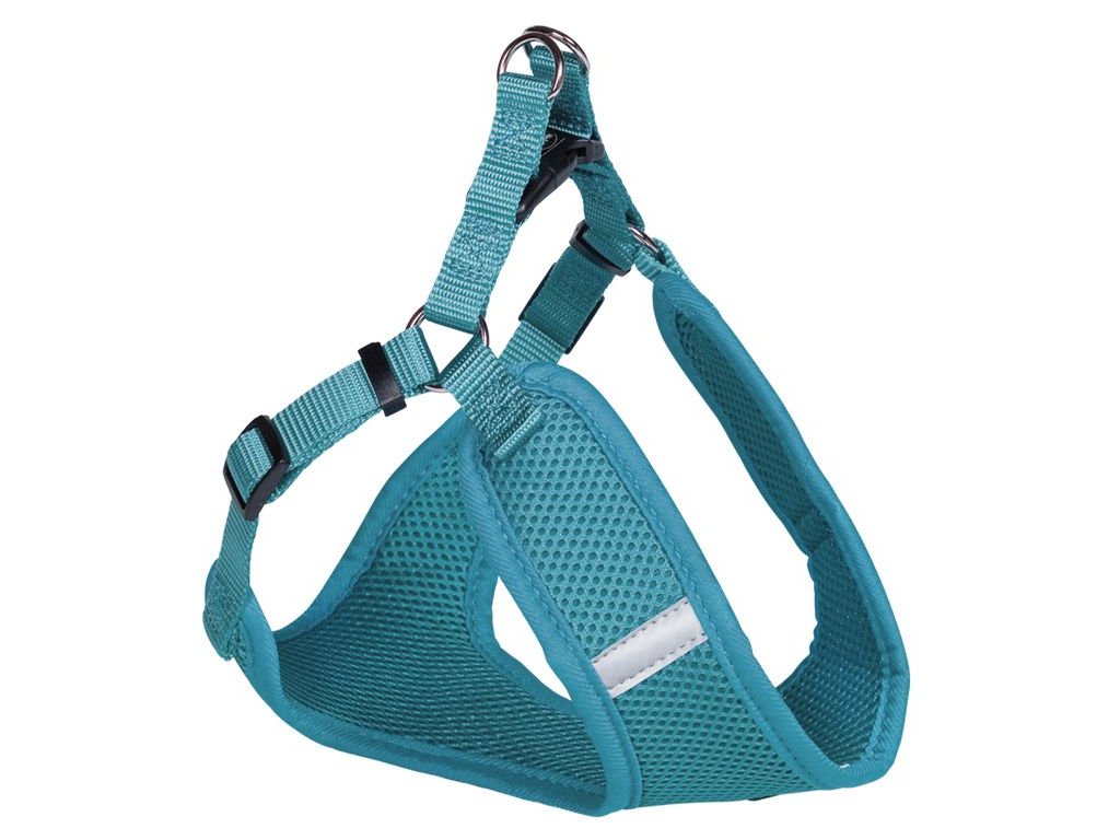 Oblíbený hrudní postroj Nobby pro psy. Je vyrobený ze síťoviny z prodyšného materiálu a je vybaven vysoce viditelnými reflexními pásky pro větší bezpečnost. Velkou výhodou je, že v horkých letních dnech může být namočeno do vody a poté ochlazuje. Velmi pohodlný střih a provedení, netrhá srst, netlačí a nedře pejsky, jsou skvělou variantou pro pejsky kteří táhnou, aby nebyla zatěžována krční páteř. Díky speciálnímu tvaru se snadno a rychle nasazuje. Pro optomální přizpůsobení má postroj nastavitelné popruhy. Barva tyrkysová. Obvod hrudníku 48-56cm.Doplňkové parametry