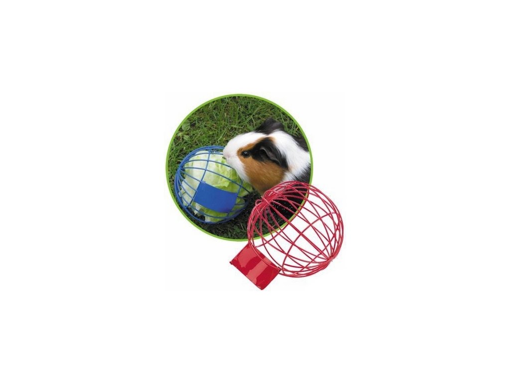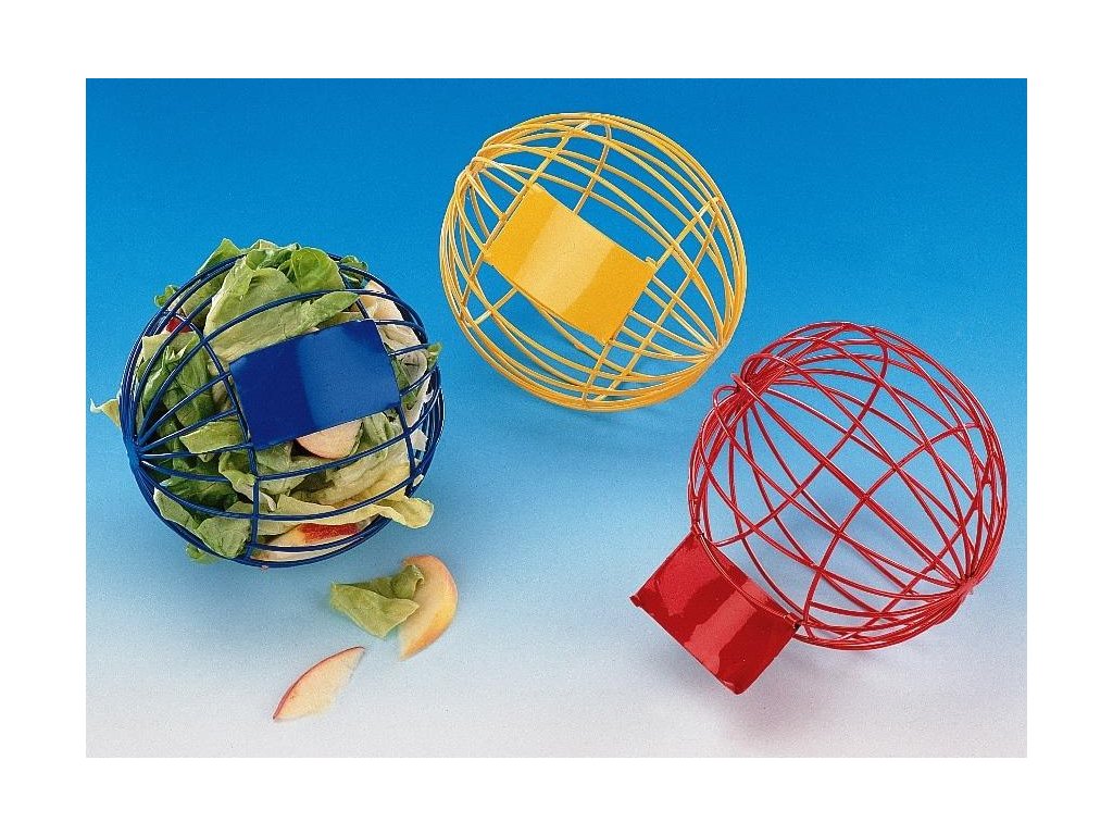 Krmítko ve tvaru míčku. Velikost ø 10cm. Zhotovený ze silného drátu s otvorem pro potravu. Můžete plnit salátem, ovocem nebo jinými pamlsky. Různé barvy.Doplňkové parametry