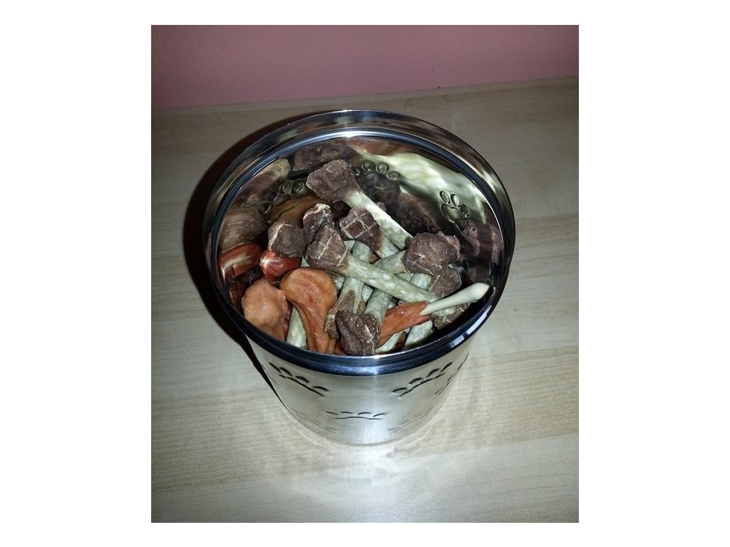 Oblíbené praktické dózy na doplňkové krmivo. Vyrobeno z ušlechtilé nerezové ocely. Balení obsahuje 2 ks (900 ml, rozměr 12 x ø11cm + objem 1600ml, rozměr 15 x ø13cm) K uchování čerstvosti pamlsků nebo krmiva.Doplňkové parametry