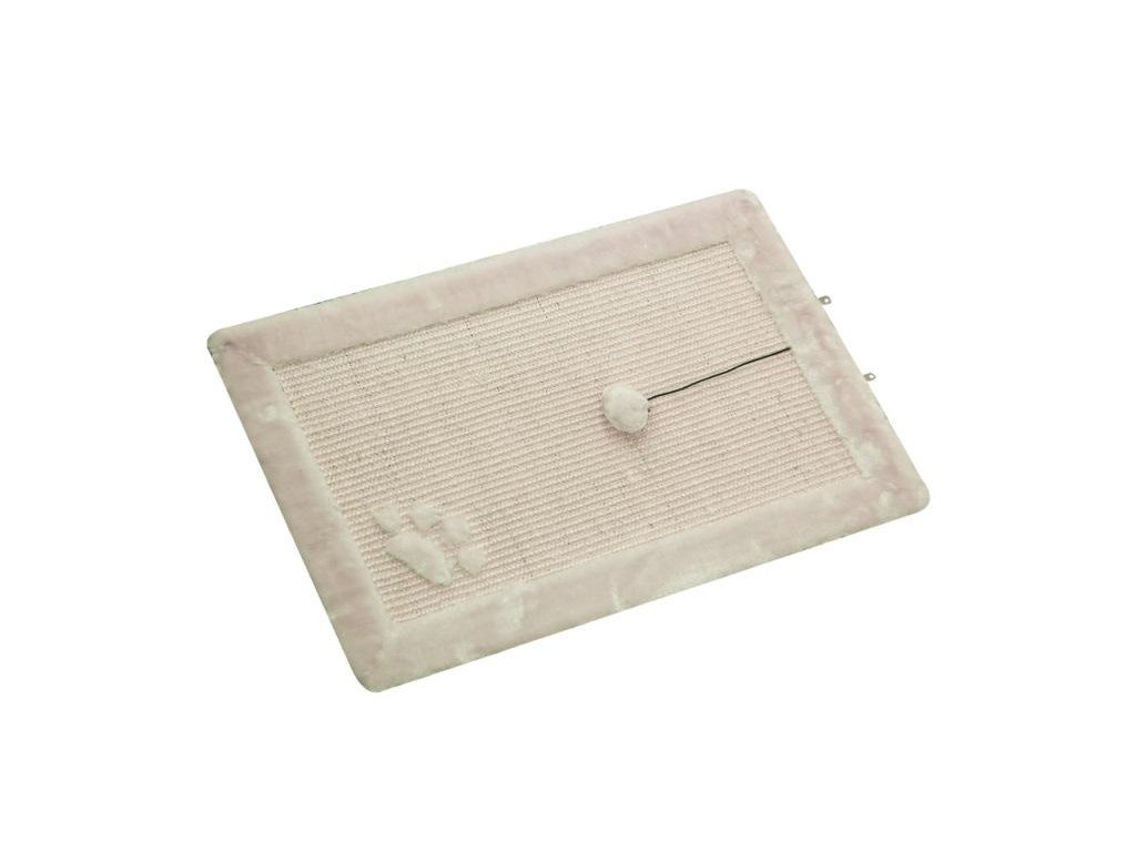 - škrabací podložka lemovaná plyšem - vyrobeno ze sisalu - plyšová bambulka s rolničkou na gumičce - umožňuje kočce provozovat své škrabací zvyky - může být položeno na zemi, nebo upevněno na stěně - škrabadlo co nezabírá místo - velikost 58x37cm Broušení drápků je pro kočky velmi důležité. Aby se předešlo tomu, že by kočka poškrábala koberec nebo nábytek, je nezbytné jí poskytnout nějaký jiný vhodný objekt a materiál ke škrábání. Sisal je přírodní, velmi masivní vlákno, které kočkám pomáhá zbavit se šupinovité svrchní vrstvy na jejich drápcích a tím je zabráněno zarůstání drápků. Podložka může být připevněna na zeď nebo položena na podlahu. K podložce je připevněna hračka na pružině.Doplňkové parametry