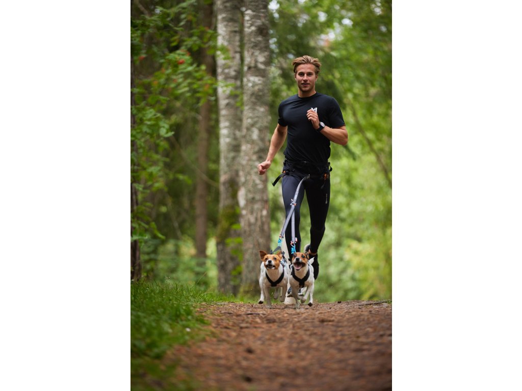 Na sportovní aktivity se dvěma psy, kde je pes celou dobu aktivity v tahu doporučujeme pro psy od cca 10 kg dvě vodítka Bungee leash. Vodítko pruží v celé své délce a pohyb s ním je ještě příjmnější.