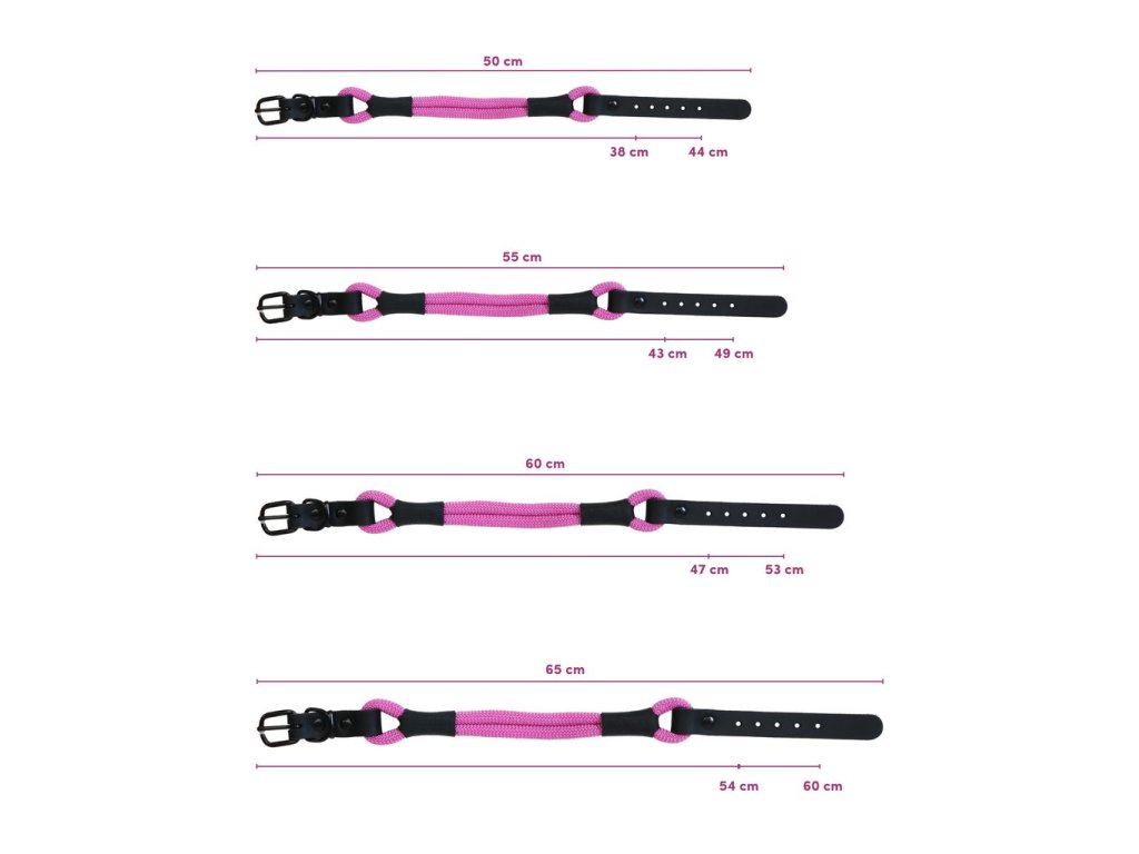 Obojky jsou vyráběny z pevného horolezeckého lana, které zaručuje vysokou odolnost a dlouhou životnost a jsou doplněny o prvky z pravé kůže, které dodávají obojku elegantní vzhled.