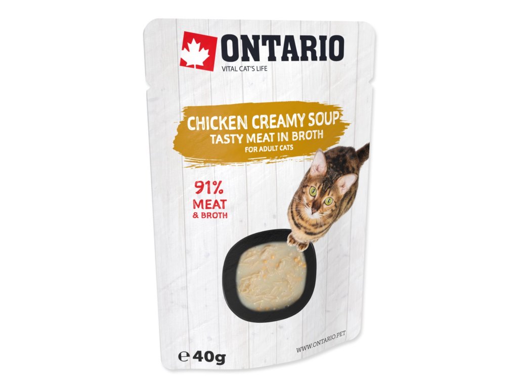 Doplňkové krmivo pro dospělé kočky – polévka s kousky kuřete a se sýrem, kterou můžete dopřát samostatně nebo jako doplněk k suchému krmivu.