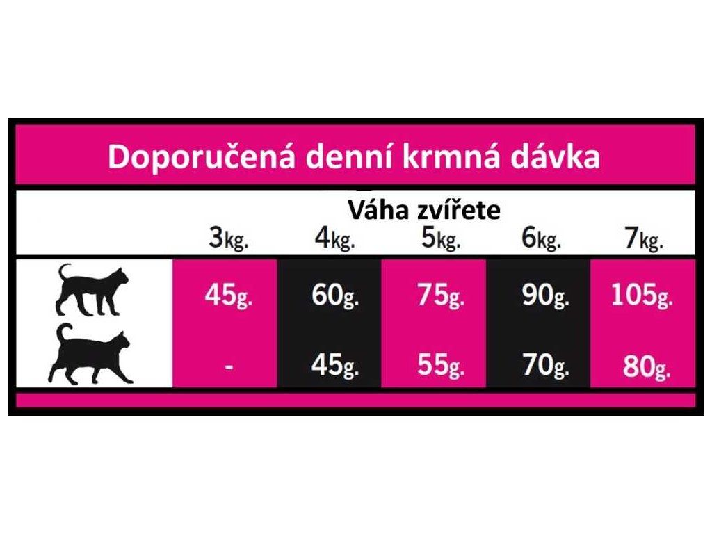 Snadno stravitelné sacharidy, pro zajištění kvalitní srsti, kůže a podporu trávení. Obsah omega 3 a 6 esenciálních mastných kyselin pro správné fungování mozku a optimální kondici kardiovaskulárního systému. Obsah zinku napomáhá udržovat zdravou kůži a lesklou srst. FOS + MOS s prebiotickými účinky přispívá ke zdraví trávícího traktu. Vysoká kvalita různých druhů masa, olejů a extraktů dělá krmivo velmi chutné i pro vybíravé kočky.