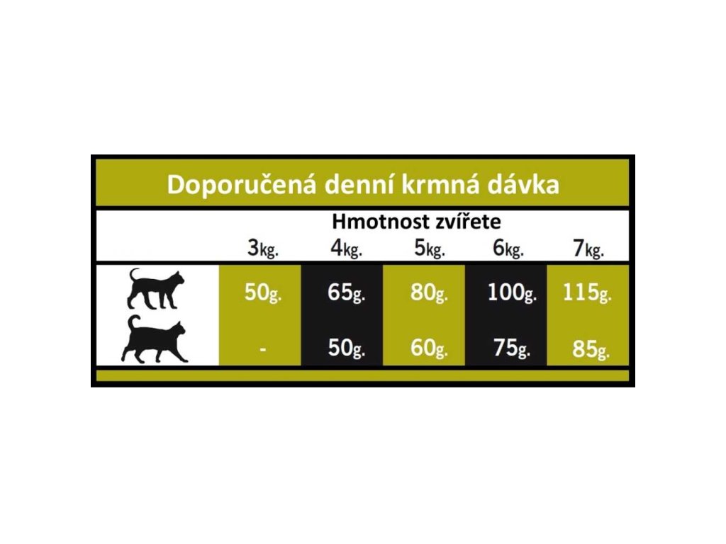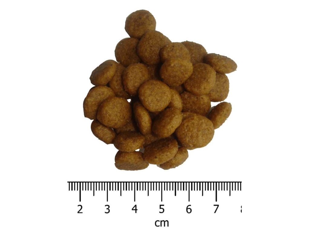 Analytické složky: Hrubý protein 31,5 %, hrubý olej a tuky 16 %, mastné kyseliny omega 6: 3 %, mastné kyseliny omega 3: 0,8 %, hrubá vláknina 5 %, celková dietní vláknina 10 %, hrubý popel 7,1 %, vápník 1,2 %, fosfor 0,9 %, vlhkost 9 %.