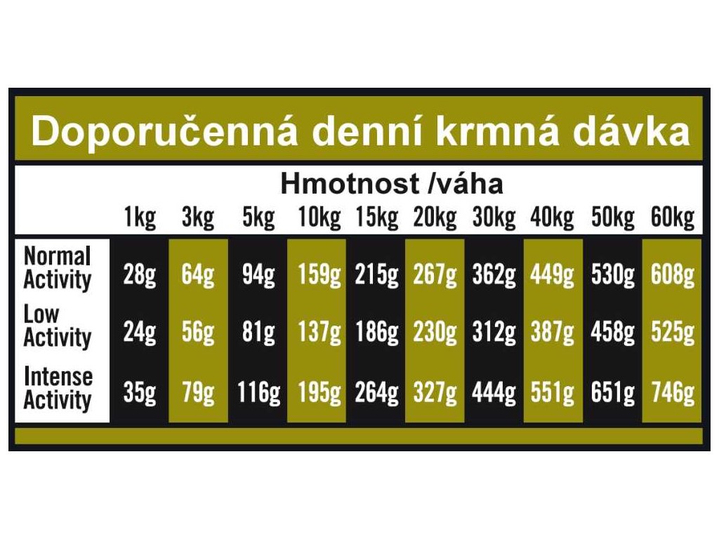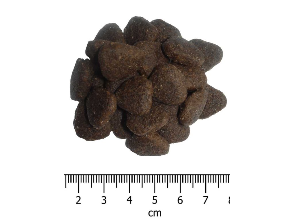 Analytické složky: Hrubý protein 27 %, hrubý olej a tuky 16 %, EPA+DHA 400 mg / kg, hrubá vláknina 2,50 %, hrubý popel 7 %, vápník 1,1 %, fosfor 0,8 %.