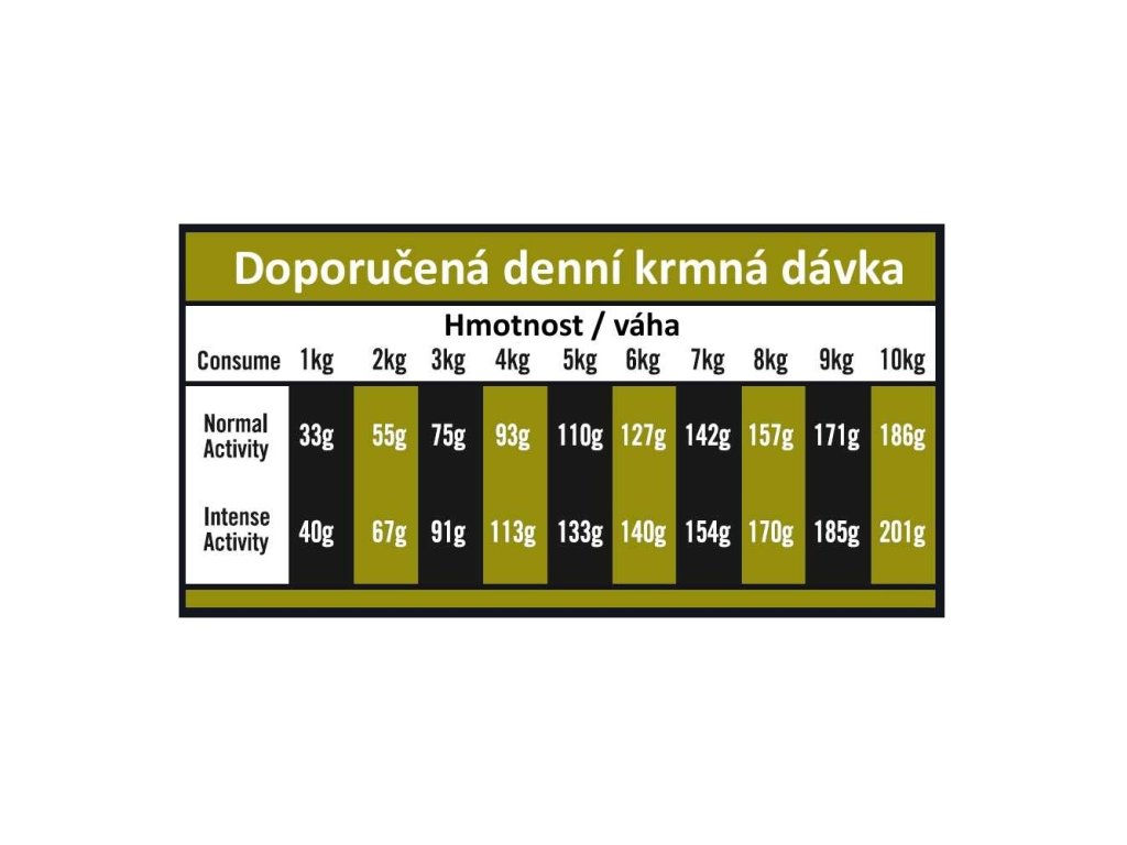 Jako jediný zdroj živočišných bílkovin s vyváženým poměrem bílkovin a tuku je použito králičí maso - monoproteinová strava výrazně snižuje riziko vzniku intolerancí a potravinových alergií. Krmivo neobsahuje obiloviny je tedy hypoalergenní a snadno stravitelné .