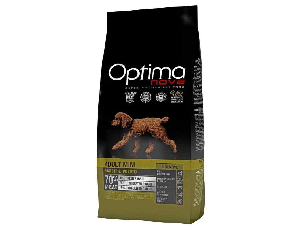 OPTIMAnova Dog Adult Mini Digestive Rabbit & Potato GF složené z kvalitních bílkovin a lehce stravitelných sacharidů v kombinaci s prospěšnými tuky. Krmivo obohacené o vitamíny, minerální látky a antioxidanty.