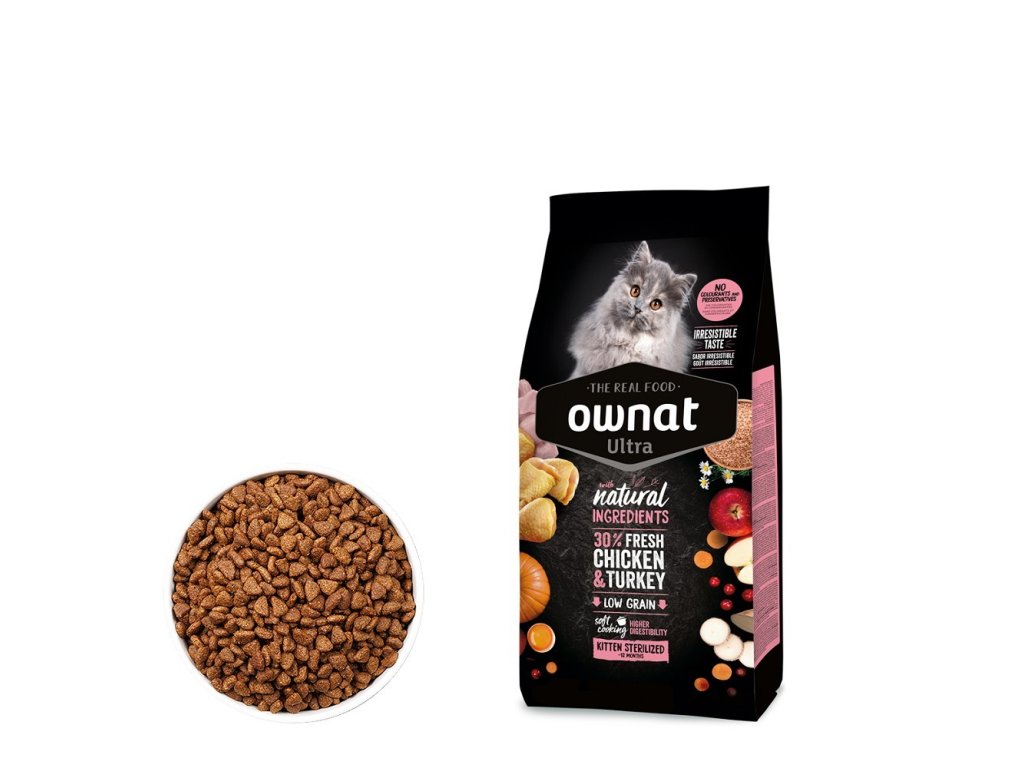 Ownat Ultra Kitten Sterilized je určené pro kastrovaná koťata, která mají nižší energetické nároky, ale stále potřebují výživu bohatou na bílkoviny pro správný růst a vývoj. Obsahuje 30 % čerstvého kuřecího a krůtího masa, které poskytuje vysoce hodnotné bílkoviny s vynikající stravitelností. Snížený obsah kalorií pomáhá předcházet nadváze.
