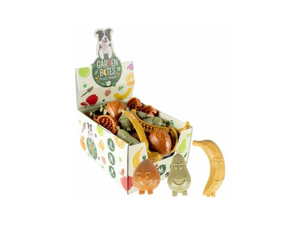 Vegetariánské pamlsky Garden Bites Fruit Blast jsou ideální odměnou pro vašeho psa. Obsahují velkorysý podíl batátů (55 %) doplněný banánem, broskví a hruškou. Batáty jsou bohaté na vitamíny, vápník a železo. Speciální tvar pamlsků pomáhá masírovat dásně a čistit zuby psa. Přírodní extrakt z máty navíc osvěžuje dech. 100% bezlepkové pamlsky jsou snadno stravitelné a díky tomu vhodné i pro psy s alergiemi. A navíc jsou chuťově naprosto neodolatelné!