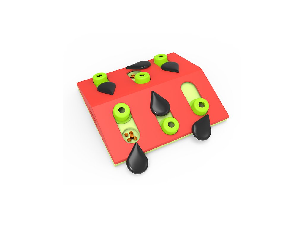 Ukryjte pamlsky nebo oblíbené granulky pod melounová semínka nebo pod zelené kolíčky (pamlsek vhoďte dovnitř ovorem) a připravte své kočce dlouhotrvající zábavu. Pamlsky lze jednoduše získat posunutím černého semínka, složitější hru pak nabízí zelené kolíčky, které je třeba posunout na místo odklopeného semínka, pamlsek se dostane do prohlubně. Když kočka odsune kolíček drážkou zpět, získá svou mlsnou odměnu.