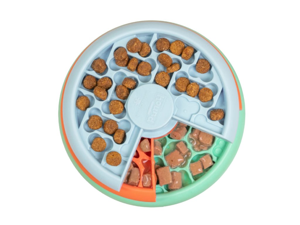 Umístěte pamlsky, granule nebo mokré jídlo do přihrádek ve všech 3 patrech. Ukažte svému psovi, jak hra funguje, a povzbuďte ho, aby si svoji odměnu vyčmuchal a dostal ji ven. Psi se musí pohybovat ve třech patrech přihrádek, otáčením každé z nich, aby vydolovali své pamlsky. Začněte tím, že umístíte pamlsky nebo jídlo pouze do horního patra, nechte ho pochopit hru. Následně mu hledání udělejte náročnější tím, že naplníte všechny 3 patra.