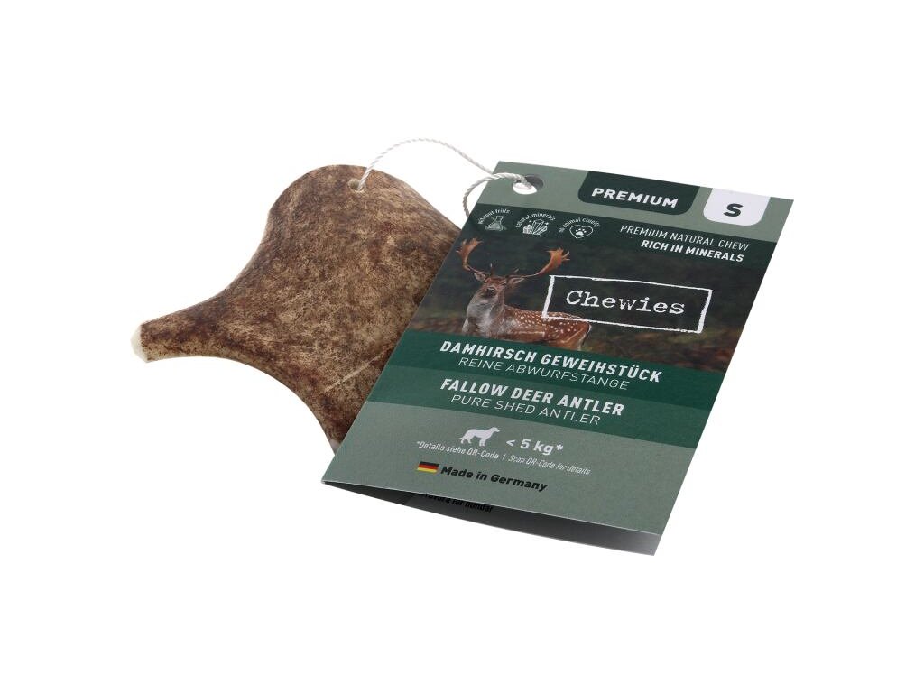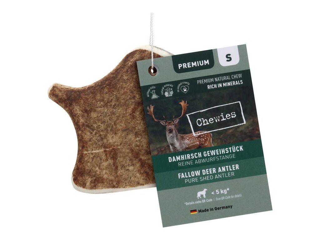 Stoprocentně čisté shozené dančí paroží vhodné jako žvýkací pamlsek k čištění zubů psa, k uspokojení potřeby žvýkání a pudu hravosti psa. Nejpřirozenější žvýkací pamlsek na světě. Dančí paroží je o trochu měkčí a tenčí než paroží jelení a je tak vhodné pro mladé psy, psí seniory a psy, kteří mají menší sílu v zubech. Paroží také obsahuje mnoho cenných minerálů a výživných látek. Psi mají od přírody výraznou potřebu žvýkání, kterou paroží s minerály dokonale uspokojí přirozeným způsobem, bez ohledu na věk a plemeno. Paroží je zároveň výborná a odolná hračka, která psa zabaví na dlouhou dobu. Žvýkaní je navíc pro psa důležitou relaxací. Výskyt a vlastnosti paroží Chewies paroží s minerály jsou stoprocentně vyráběny ze shozů paroží vysoké zvěře. Daněk ztrácí paroží jednou ročně zcela přirozeným způsobem. Shozy se sbírají a ručně zpracovávají v různých velikostech. Shozené paroží se svými vlastnostmi ideálně hodí jako žvýkací hračka pro psy. Struktura je tvrdá a maximálně odolná. Je vyloučeno, aby pes paroží rozbil nebo rozkousal. Nemůže se tedy zranit, jak se například stává v případě ostrých úlomků klacků či větví. Shozené paroží je asi nejstarším pamlskem pro posílení žvýkacích svalů a čištění zubů, který vlci upřednostňují již po tisíciletí. Různé funkce Chewies paroží s minerály Potřeba žvýkat Psi jakéhokoli věku a jakéhokoli plemene od přírody velmi rádi žvýkají. Zvýšenou touhu po žvýkání lze navíc ve zvláštní míře pozorovat při výměně psího chrupu. Této základní potřebě vycházejí Chewies paroží s minerály vstříc dokonalým způsobem. Paroží, která jsou robustní a nelámou se, odolají sebesilnější čelisti. Pes s potřebou žvýkat se tak může dosyta vyřádit. V důsledku toho, že jsou domestikovaní psi většinou krmeni hotovou průmyslovou stravou, má uspokojování přirozené žvýkací potřeby zvláštní význam. Zatímco vlk ve volné přírodě může žvýkat kosti své kořisti, hledá domácí pes něco srovnatelného ve své misce marně. Vraťte svému psovi kus přírody v podobě Chewies paroží s minerály. Péče o zuby To, co je kost ve volné přírodě, jsou Chewies paroží s minerály ve vašem obýváku – přirozená péče o zuby psa. Žvýkáním pes obrušuje nejen paroží, ale současně i zubní kámen ze svého chrupu. Výsledkem jsou zdravé a pevné zuby v odolné a pevné dásni! Paroží je 100 % přírodní a navíc obsahuje mnoho výživných a minerálních látek. Relaxace a zdolávání stresu Vydatné žvýkání, hryzání a kousání Chewies paroží s minerály je ryzí relaxací pro psí duši. Při žvýkání se vašemu čtyřnohému příteli uvolňují endorfiny, které způsobují pocit štěstí. Po dlouhém a nerušeném zaměstnání žvýkacím pamlskem je proto pes klidný a vyrovnaný. Zvíře se po dni plném zážitků rádo uchýlí do ústraní se „svým úlovkem“ z paroží a zpracovává svým způsobem to, co zažilo. Hra a zábava Chewies paroží s minerály slouží dále jako dobrá a odolná hračka. Tyčky z paroží slouží například na zahradě jako užitečná hračka, kterou psovi házíte a on ji obětavě a nadšeně aportuje. Když se pes nudí, poslouží žvýkací tyčky jako občasné příjemné zaměstnání. Žvýkací tyčku posouvá tlapkami po zemi nebo ji tlamou vysokým obloukem vyhazuje do vzduchu. Ať už Chewies paroží s minerály nakonec použijete jakkoli, máte kromě nadšení svého psa ještě jistotu, že jako odpovědný chovatel používáte ekologicky nezávadný výrobek. Tyčky ze shozeného paroží se k vám dostávají přesně tak, jak vyrostly jelenovi – bez změkčovadel, barviv nebo chuťových látek. Chewies paroží s minerály nejsou chemicky ošetřeny. Velikost Small je vhodná pro psy do 12 kg. V balení je jeden kus o hmostnosti 50 - 80 g. Složení: 100% dančí paroží Analýza: hrubý popel 53%, hrubý protein 35% vlhkost 8%, hrubá vláknina 3%, tuk 0,1%. Obsah minerálních látek: vápník 23%, fosfor 7%, sodík 1,3%, hořčík 5140 mg/kg, železo 192 mg/kg Shozené paroží vysoké zvěře je omezenou surovinou. Ručně vybrané a přiřezávané kusy paroží nejsou laciné, avšak cena odpovídá jejich hodnotě. Váš pes se bude z Chewies paroží radovat 4 - 6 týdnů.Doplňkové parametry