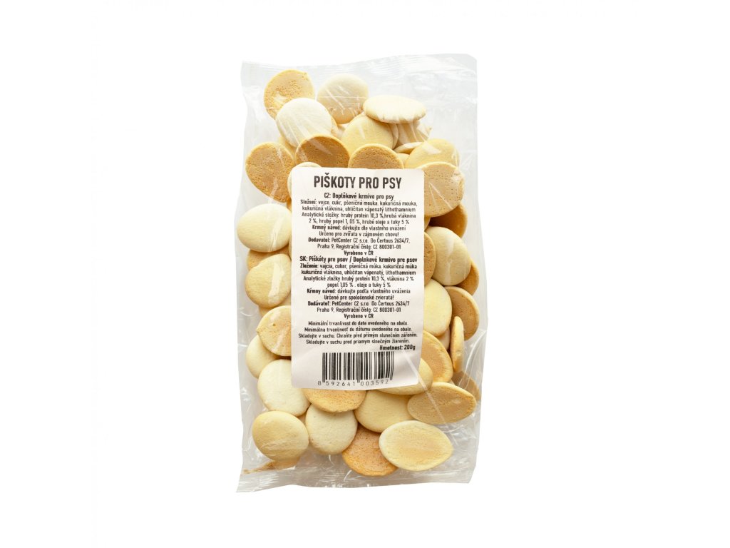 Krmné piškoty pro psy 200 gLahodné a křupavé piškoty jsou pamlsky pro psy všech plemen a velikostí. Skvěle chutnají, mají snížený obsah lepku a cukrů a navíc jsou obohacené o cenné vitaminy a minerální látky. Vyrobeny z přírodních ingrediencí v podobě obilovin a vajec.