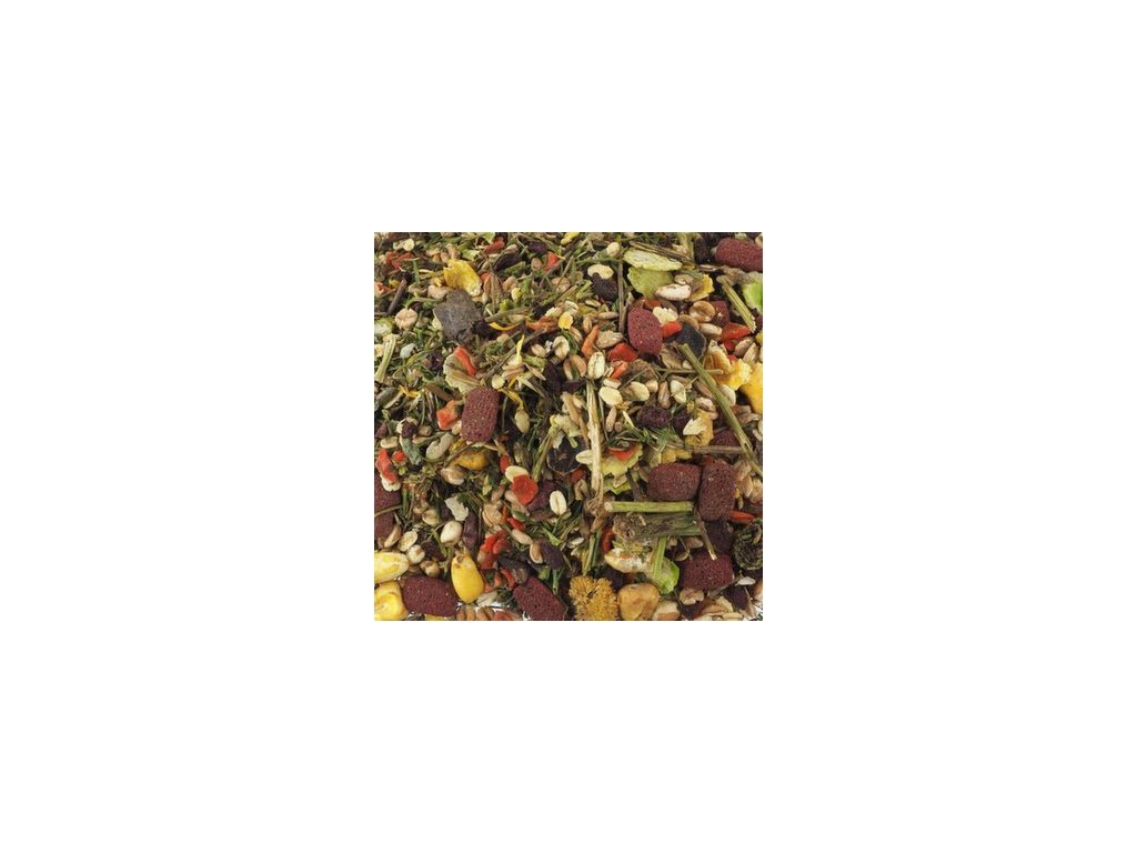 Složení: sušená červená řepa 11 %, pšeničné vločky 10 %, ovesné vločky 10 %, hrachové vlocky 9,5 %, sušená mrkev 8 %, sušená petržel 6 %, kukuřičné pukance 5 %, pšeničné pukance 5 %, sušená vojtěška 5 %, pšenice 5 %, extrudovaná kukuřičná mouka 4 %, karob 3 %, kukuřičné vločky 3 %, sušená meduňka 3 %, sušená pampeliška 3 %, sušená echinacea 2,8 %, sušená máta peprná 2 %, rýžové pukance 2 %, horské luční seno 1,2 %, sušené květy měsíčku lékařského 1 %, sušené květy červeného jetele 0,5 %.