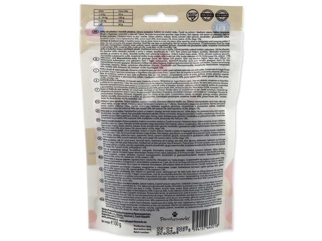 100% přírodní jerky z kuřecího masa a mořských plodů pro malé psy a kočky.