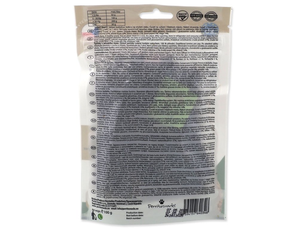 Složení: jehněčí maso, škrob, přírodní rostlinný glycerin.
