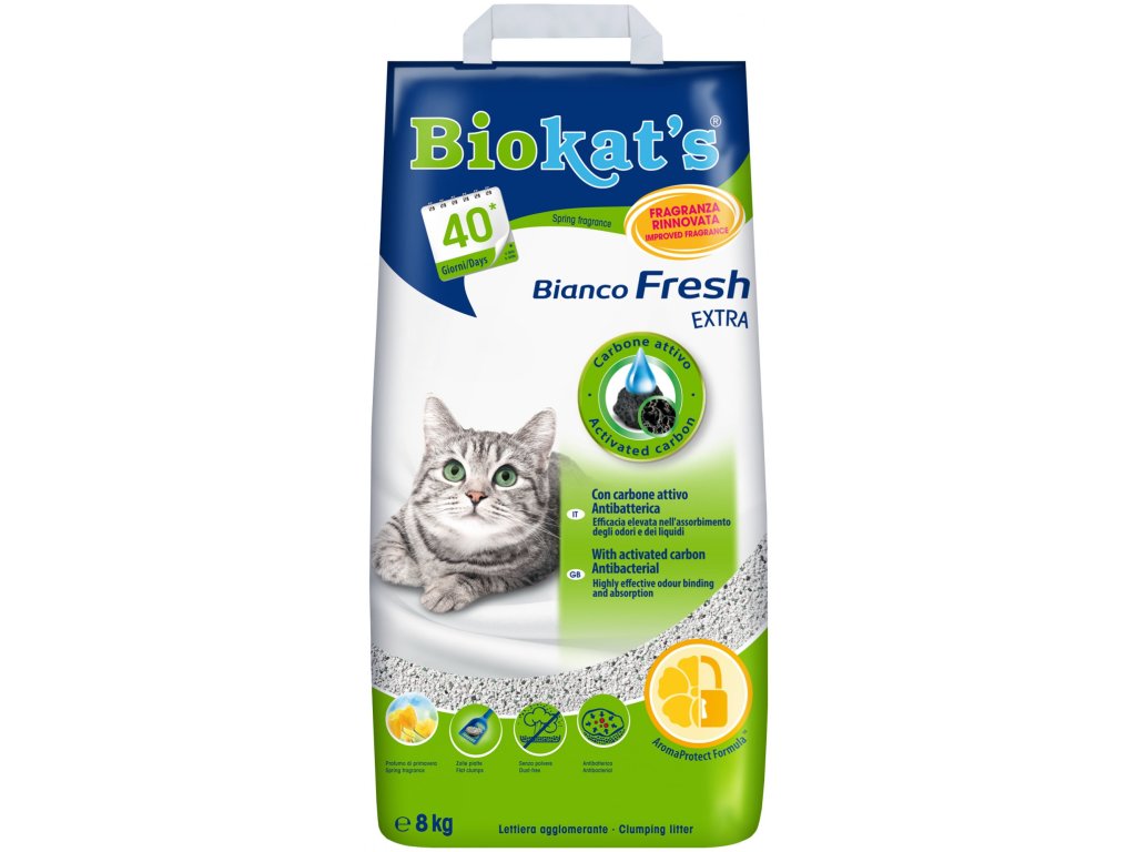 Podestýlka BIOKAT'S BIANCO FRESH EXTRAStelivo do kočičích toalet s extra velkou savostí. Stelivo z přírodního jílu je doplněné o aktivní uhlí, které má extrémně velkou savost, takže zvládá spolehlivě pohltit vlhkost a pachy třeba od více mazlíčků. Podestýlka je bezprašná a při zvlhnutí tvoří ploché hrudky. Zrna steliva jsou vyráběna mikro-procesem, který zajišťuje stejnoměrnou velikost zrn a tím pádem rovnoměrnou savost a pevnost hrudek. V záchodku vydrží až 50 dní. Jíl pochází z kontrolovaných německých dolů, aktivní uhlí se vyrábí z kokosových skořápek. S jarní vůní.