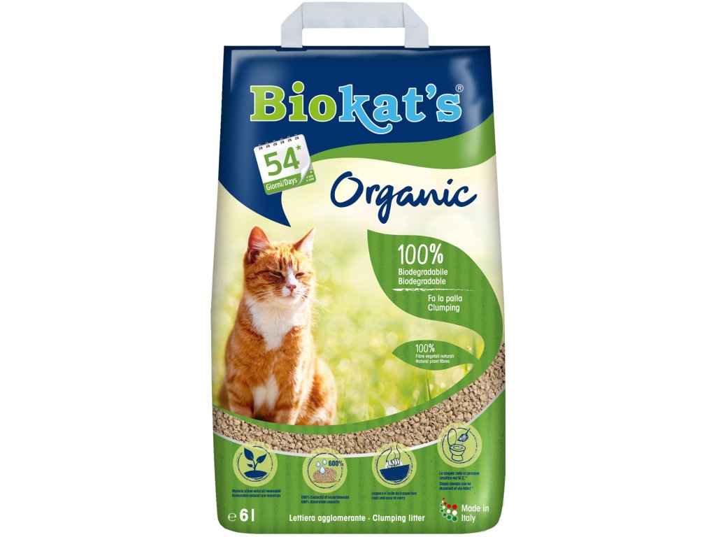 Podestýlka BIOKAT'S ORGANICPřírodní podestýlka do kočičí toalety z rostlinné vlákniny je alternativním způsobem steliva pro kočky. Je 100% přírodní a z obnovitelných zdrojů. Stelivo má vysokou savost (až 600%), jeho výhodou je také nízká hmotnost a bezprašnost. Nelepí se kočkám na packy, takže se nevynáší ze záchodu. Stelivo lze kompostovat nebo vhodit do záchodu. V kočičí toaletě vydrží až 90 dní.