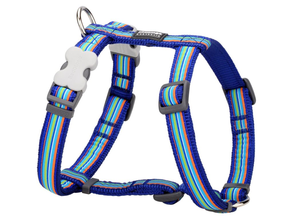 Velikost postroje: - obvod krku - 36 - 59 cm - obvod hrudníku - 45 - 66 cm - délka břišního pásu - 14 - 19 cm - délka hřbetního pásu - 10 cm - šířka popruhu - 20 mm Postroj je velikostí vhodný např. pro bígly, pudly, kokršpaněly a další střední plemena. Postroje Red Dingo jsou vyrobené z kvalitního nylonového popruhu. Okraje jsou hustě tkané pro ještě větší odolnost vůči oděru. Našitá stuha se vzorem je utkaná speciální technikou, která zaručuje vysokou odolnost a trvanlivost. Použitá příze zajišťuje skutečnou stálost barev. Postroje jsou vybaveny dvěma originálními plastovými sponami Bucklebone ve tvaru kosti pro snadné oblékání postroje. Spona Bucklebone patří mezi nejpevnější na trhu a je vyrobená pouze z toho nejlepšího materiálu. Kroužek je vyrobený z karbonové oceli. Zakončení popruhu je pod úhlem 20 stupňů, čímž je dosaženo maximálního komfortu pro psa.Doplňkové parametry
