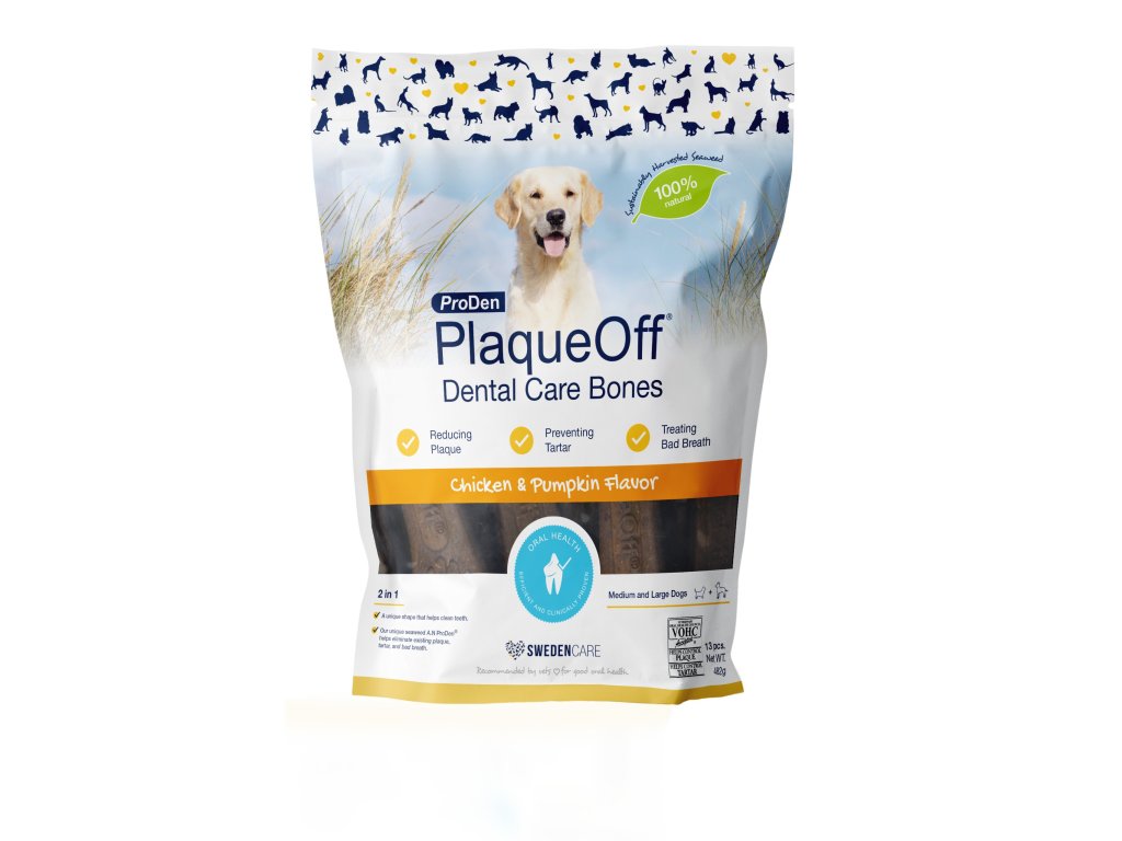 ProDen PlaqueOff® Dental Bones jsou žvýkací kosti, které obsahují 100% přírodní a klinicky ověřenou složku z mořských řas A.N ProDen®. Pomáhají při problémech s ústní dutinou dvojím účinkem – A.N ProDen® a jedinečným tvarem kosti s abrazivním působením. Pokud se používají podle pokynů, pomáhají kontrolovat a zlepšovat tvorbu plaku a zubního kamene, což vede k svěžejšímu dechu.
