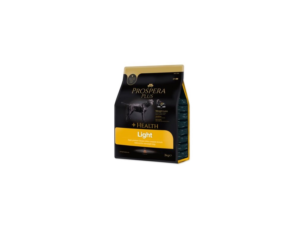 PROSPERA PLUS Light je superpremiové krmivo, s recepturou vhodnou pro dospělé psy trpící nadváhou nebo psy s menší aktivitou. Základem receptury je kvalitní lehce stravitelné kuřecí maso s nízkým obsahem tuku. Dalšími důležitými složkami krmiva je komplex 3 vláknin (jablečné, řepné a z jitrocele), které napomáhají správné regulaci váhy psů. Krmivo je obohaceno o rybí tuk (omega 3 mastné kyseliny), který zlepšuje zdravou srst a kůži. Chondroprotektiva glukosamin a chondroitin pomáhají posilovat a stabilizovat kosti a klouby.