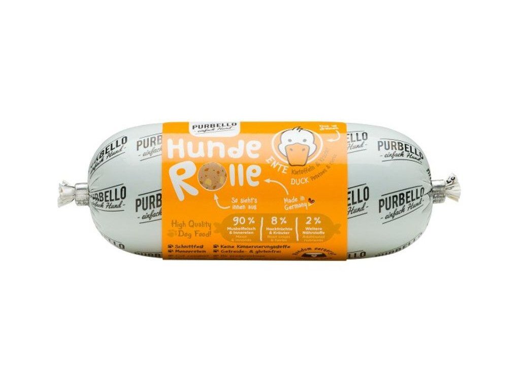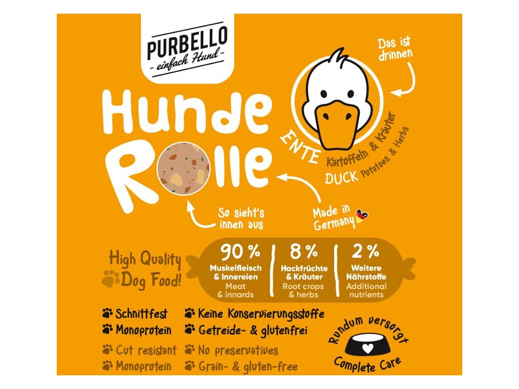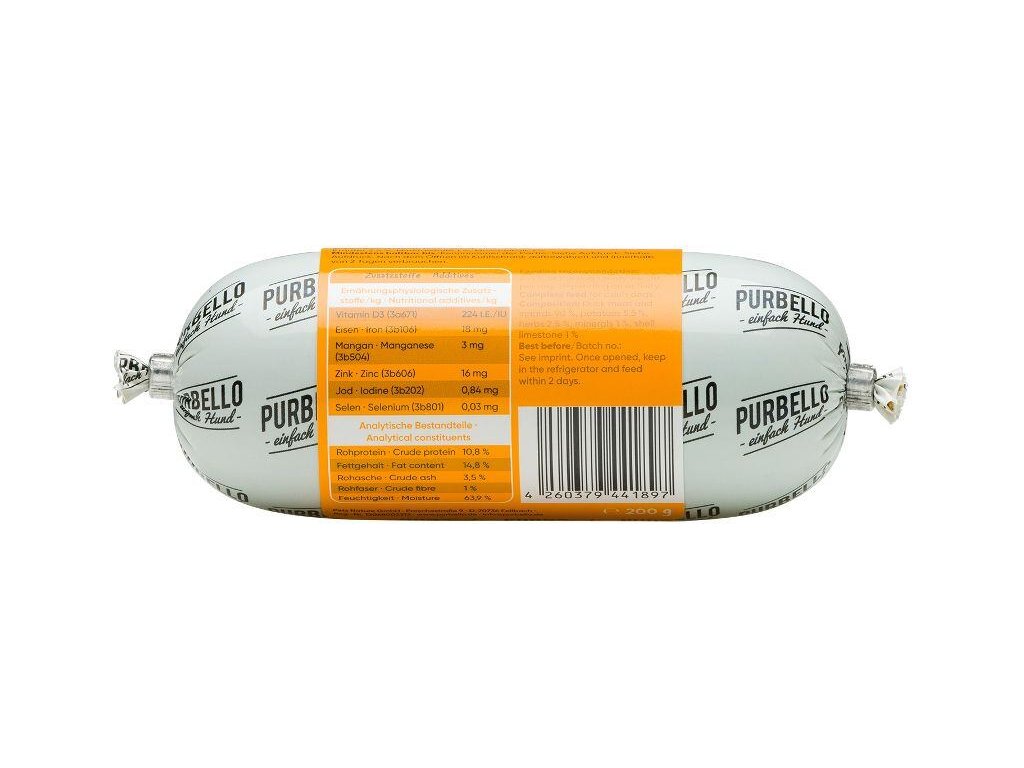 Zdravý a chutný masový salám, který obsahuje 90 % čerstvého kachního masa, brambory a bylinky. Vhodné i pro psy s citlivým zažíváním. Jedná se o kompletní krmivo. PURBELLO je monoproteinové mokré krmivo pro psy vytvořené pro zdravou výživu psů. Díky svému složení s jediným zdrojem živočišných bílkovin, vysokým podílem masa a té správné receptuře je PURBELLO zdravé a vysoce chutné. Krmivo je také velmi dobře stravitelné a vhodné i pro psy s citlivým zažíváním. PURBELLO: - monoproteinová receptura - snadné dávkování - vysoký podíl masa – žádná moučka - pouze čerstvé maso, zelenina a ovoce - bez obilovin - bez lepku - bez umělých přísad - bez konzervačních látek - vyrobeno v Německu Složení: kachní maso a kachní vnitřnosti 90%, brambory 5,5%, bylinky 2,5%, minerály 1%, vápenec 1% Analýza: hrubé proteiny 10,8%, hrubé tuky a oleje 14,8%, hrubé popeloviny 3,5%, hrubá vláknina 1%, vlhkost 63,9% Nutriční doplňkové látky: vitamin D3 (3a671) 224 IU, železo (3b106) 18 mg, mangan (3b504) 3 mg, zinek (3b606) 16 mg, jód (3b202) 0,84 mg, selen (3b801) 0,03 mg Doporučené dávkování: pes - 5 kg: 100 – 150 g denně, pes - 10 kg: 200 -300 g denně, pes - 20 kg: 400 - 600 g denně a pes - 30 kg: 600 – 900 g denně. Krmnou dávku přizpůsobte váze, věku a aktivitě psa. Zajistěte psovi dostatek pitné vody. Datum minimální trvanlivosti a číslo šarže najdete na zadní straně obalu. Krmivo skladujte suchu. Po otevření skladujte v lednici a co nejdříve spotřebujte.Doplňkové parametry