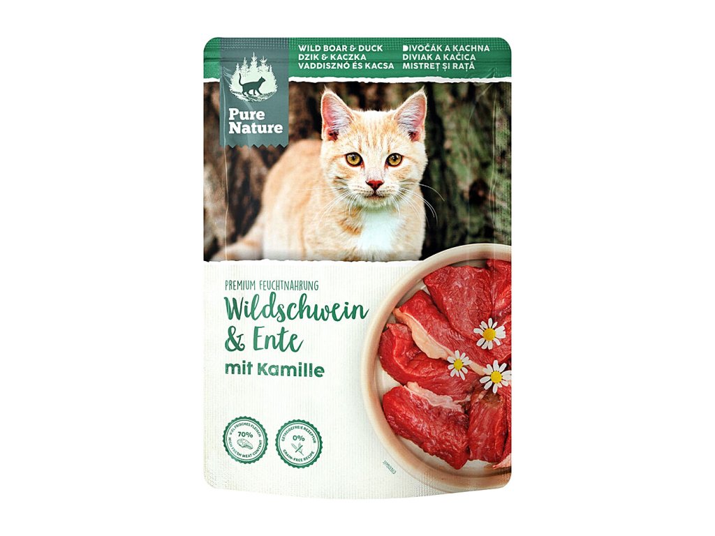 Vysoký obsah masa z divočáka a lahodné kachní maso tvoří neodolatelnou pochoutku pro kočičí šelmičky. Pure Nature kapsička Divočák a Kachna je přírodní kompletní krmivo pro dospělé kočky. Divočák a kachna tvoří perfektní kombinaci proteinů, jsou bohaté na přirozené živiny. Receptura je doplněná o heřmánek a světlicový olej.Maso z divočáka je velmi bohaté na proteiny. Přirozená strava divokých zvířat dodává masu speciální chuť a množství důležitých látek (vitamíny skupiny B, železo, draslík, fosfor, zinek). Vysoký obsah masa z divočáka (62%) dělá toto krmení pro kočky chuťově neodolatelným a velmi zdravým.