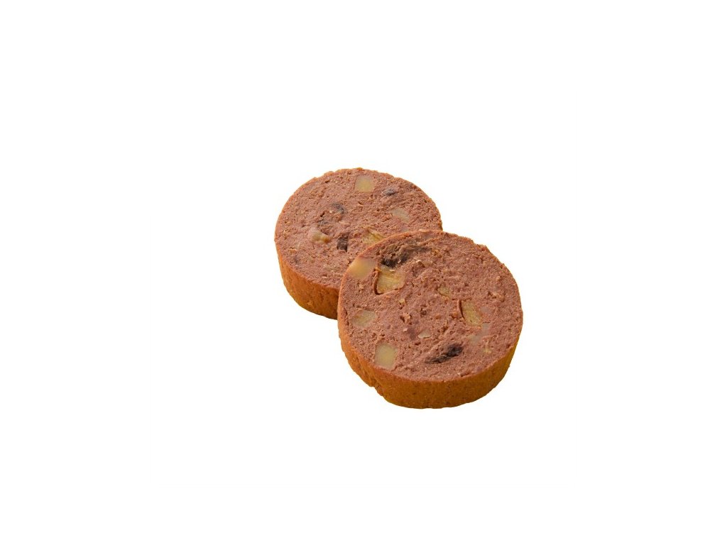 Složení: 80 % maso a vnitřnosti z jelena (70 % jelení maso, 15 % jelení srdce, 10 % jelení plíce, 5 % jelení játra), 10 % brambory, 5% pastinák, 3 % lesní plody, 2 % prášek z vaječných skořápek.